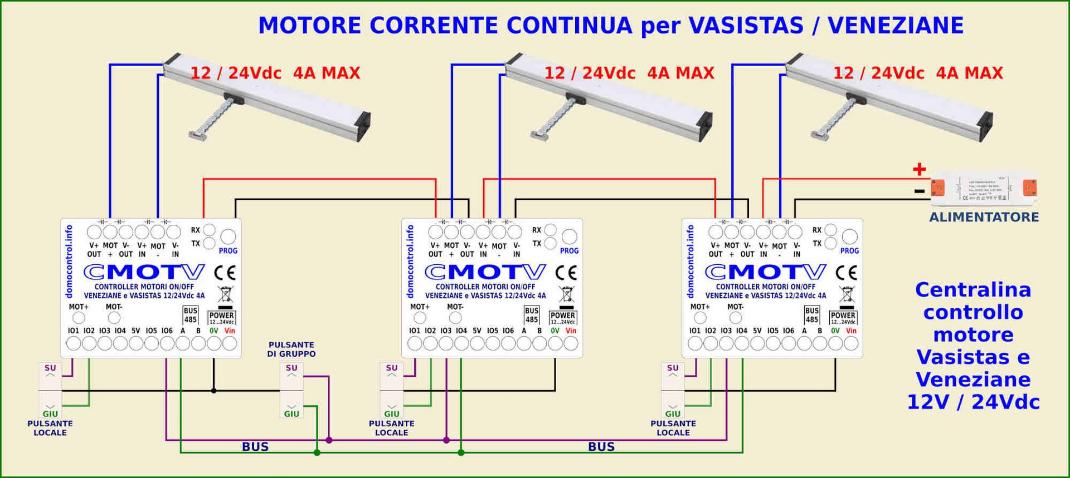 Si collegherà ad ogni centralina i pulsanti per l'azionamento del singolo motore locale e in più, tramite 2 soli fili, si potranno formare i gruppi di più controller in modo da poter azionare tutti motori con il pulsante di gruppo.