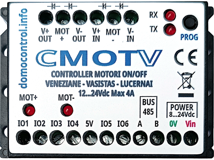 La centralina CMOTV è alimentabile da 7 a 24Vdc e dispone di 2 relè per lo scambio della tensione (rotazione) del motore.