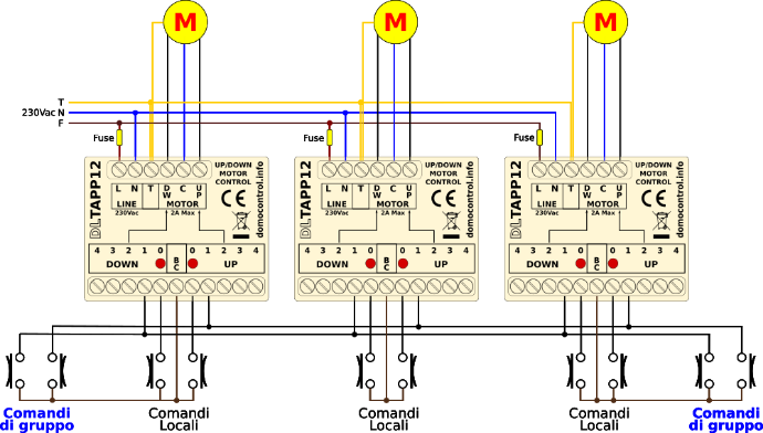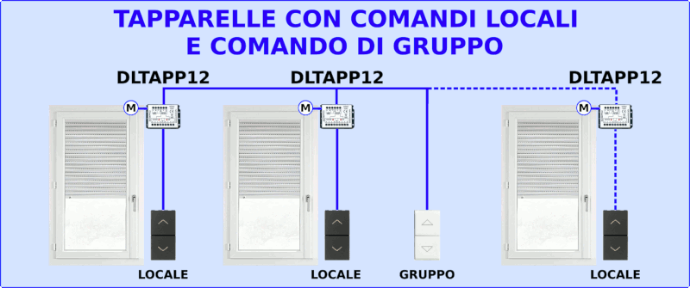 Con un solo tipo di centralina, a scelta tra DLTAPP12, DLTAPP12A o DLTAPP14, è possibile realizzare l'impianto completo di gestione dei motori SU/GIÙ per il controllo delle singole tapparelle e dei vari comandi di gruppo.