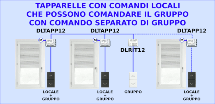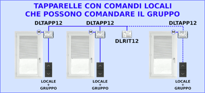 Aggiungendo una centralina del tipo DLRIT12 si ottiene la possibilità di comandare tutto il gruppo Tapparelle dagli stessi comandi finestra, semplicemente prolungando la durata della pressione sul tasto.
