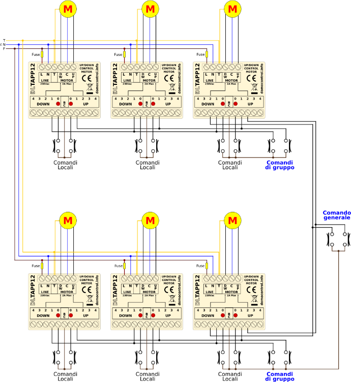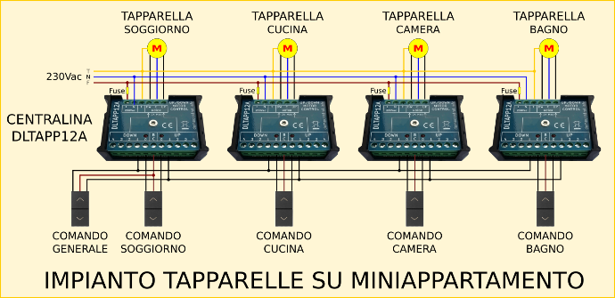 N.B. i vari gruppi di tapparelle possono essere messi sotto magnetotermici anche diversi, ma tutte le centraline collegate tra loro da un comando generale devono sottostare ad un unico differenziale, oppure bisogna disaccoppiare i comandi generali tramite relè.