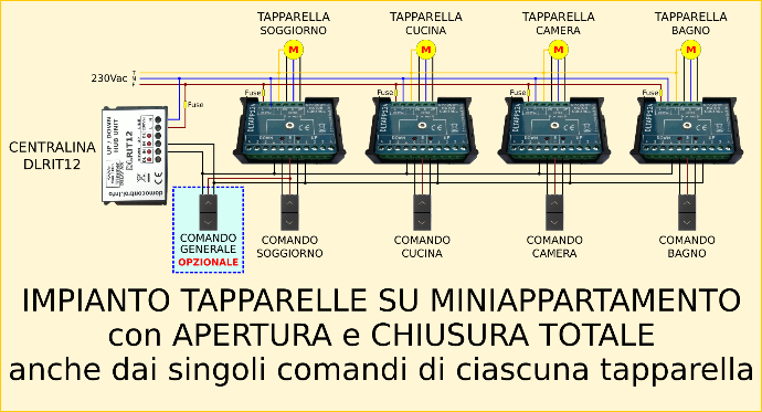 N.B. i vari gruppi di tapparelle possono essere messi sotto magnetotermici anche diversi, ma tutte le centraline collegate tra loro da un comando generale devono sottostare ad un unico differenziale, oppure bisogna disaccoppiare i comandi generali tramite relè, ma con la soluzione a relè si perde la sensibilità delle centraline DLRIT12 a monte rispetto ai comandi a valle.