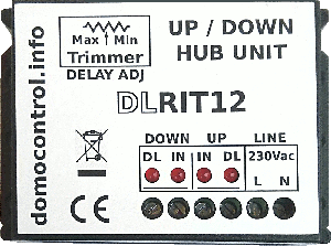 Unità di ritardo che consente di comandare un gruppo di centraline usando gli stessi comandi su/giù di una qualunque centralina del gruppo. Questa unità rileva la pressione di un qualsiasi pulsante di una centralina nel gruppo a cui è collegata e dopo un tempo regolabile circa tra 1.5 e 6 secondi, estende il comando a tutto il gruppo. Si collega in parallelo ad eventuali pulsanti generali di gruppo (che possono essere anche omessi). Suddividendo le tapparelle in gruppi è possibile attivarli in sequenza, utilizzando più ritardi regolati su tempi diversi, limitando così gli spunti di corrente.