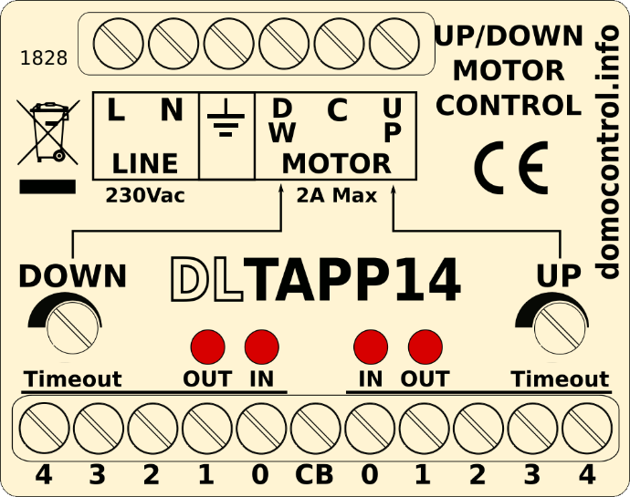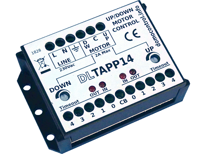 LTAPP14 è equivalente alla centralina DLTAPP12, con cablaggi uguali, ma con l'aggiunta di due led per agevolare il controllo del funzionamento e con l'aggiunta di due timer di TIMEOUT motore per le direzioni SU/GIÙ con tempo impostabile regolabile nell'intervallo 10..110 secondi, tramite trimmer accessibili dal coperchio superiore senza aprire l'unità.