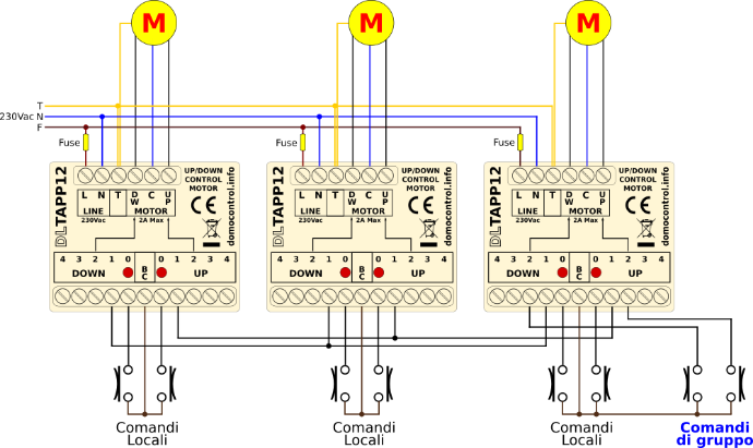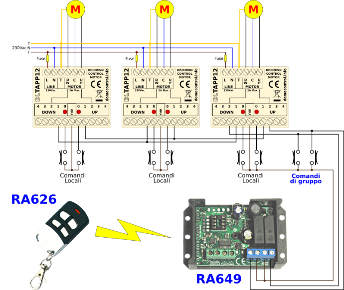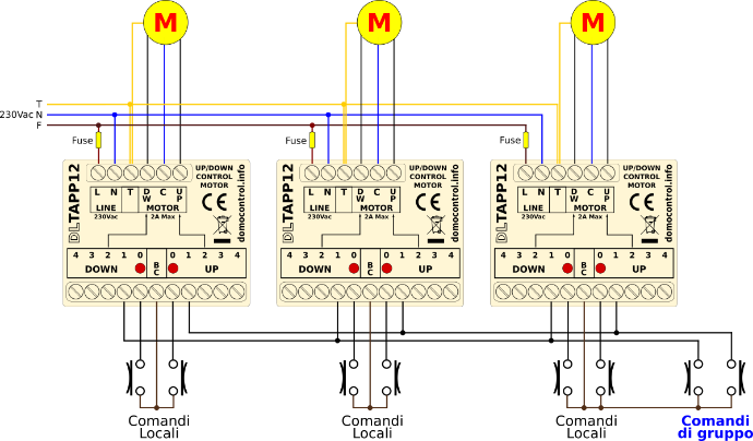 Schema semplificato con 3 centraline tapparelle e comando di gruppo.