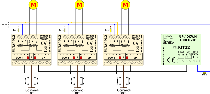 Questa unità può funzionare singolarmente e/o in combinazione con altre unità uguali e/o dello stesso tipo (DLTAPP12A, DLTAPP14) e/o con l'unità DLRIT12 che consente di comandare gruppi di finestre attraverso gli stessi comandi locali su/giù di ogni singola finestra del gruppo semplicemente prolungando la pressione dei pulsanti.
