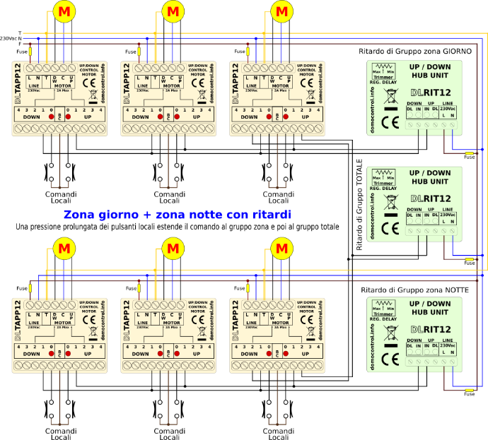 Esempio di collegamento di 2 gruppi (zona giorno e zona notte) con 3 unità ciascuno, con comandi locali che diventano comandi di gruppo e generale, prolungando la durata della pressione.