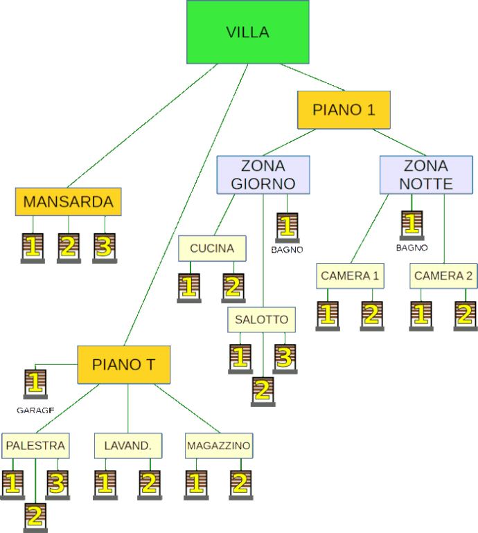 - Possibilità di centralizzare i comandi fino a 5 livelli (Es: 0 finestra, 1 Stanza, 2 Zona, 3 Piano, 4 Casa);