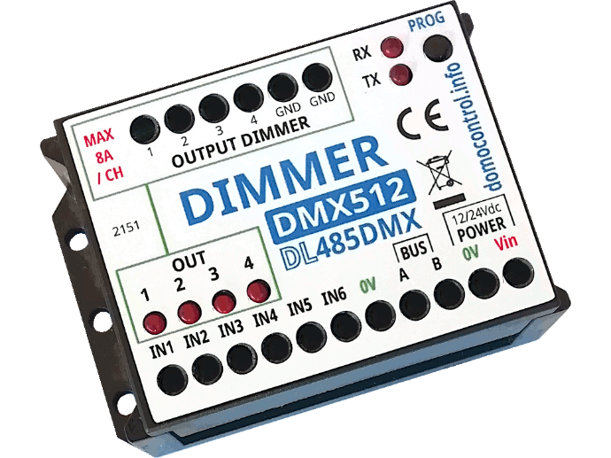 DL485DMX dispone di 4 uscite dimmerabili pilotabili da BUS DMX512, inoltre l'unità può anche funzionare come normale smart dimmer comandato da pulsanti con tutte le funzionalità di cui dispone.
