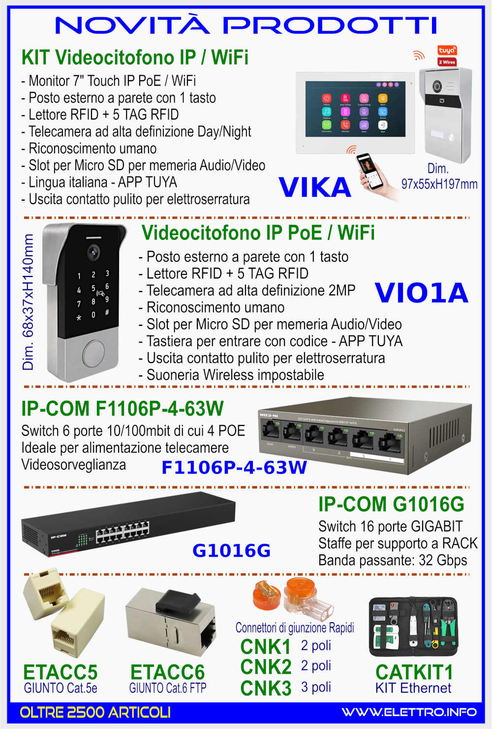 - Accessori networking (giunti Cat.5e/Cat.6, connettori rapidi CNK, kit Ethernet)