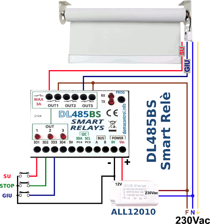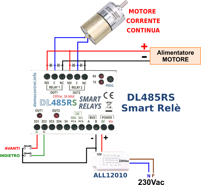 Questo caso d'uso richiede di invertire la polarità di alimentazione al motore, per questo è stato usato il dispositivo con due relè deviatori DL485RS.