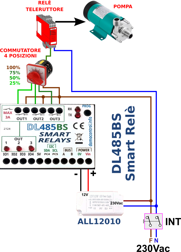 Fare attenzione allo spunto della pompa che può essere superiore alla portata dei contatti dello smart relè perciò si dovrà usare questa unità per pilotare un relè di portata superiore.
