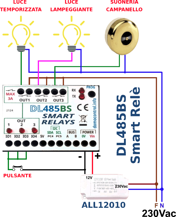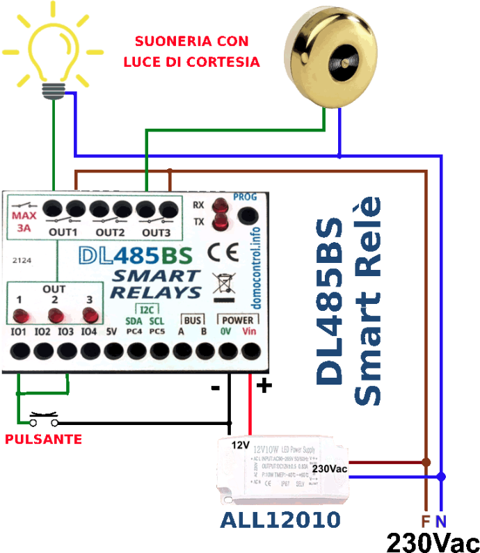 L'uscita campanello è collegata come uomo presente, mentre quella della luce è una uscita temporizzata. Il pulsante comanda entrambe le uscite.
