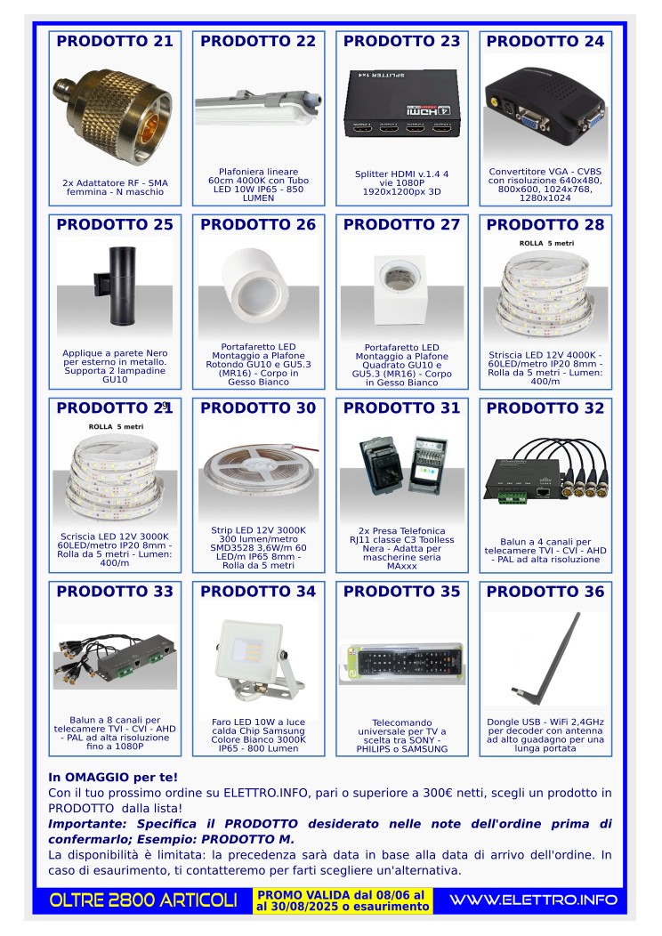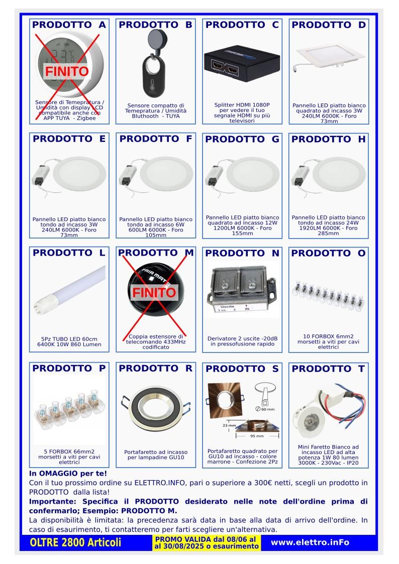 Per ringraziarti della tua fiducia, abbiamo pensato a un'iniziativa speciale: con i tuoi acquisti su ELETTRO.INFO, puoi ricevere dei prodotti in omaggio! È il nostro modo per celebrare la tua scelta e offrirti un valore aggiunto concreto.
