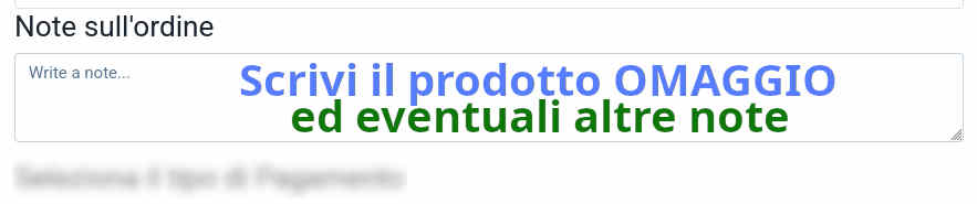 - Specificare l'Omaggio: Durante la fase di checkout, prima di completare l'invio dell'ordine, specifica chiaramente il nome del REGALO desiderato nelle "Note dell'ordine". È fondamentale inserirlo qui per assicurarci di inviarti l'articolo giusto! Ad esempio puoi scrivere sulle note dell'ordine: PRODOTTO M.